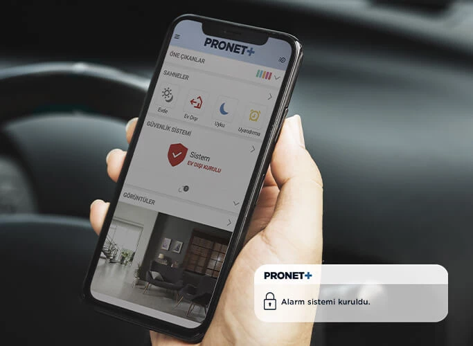 Pronet Plus mobil uygulaması üzerinden alarmınızı kurup kapatabilir, güvenlik kameralarını canlı izleyebilir, akıllı kilit, akıllı zil, akıllı priz, akıllı termostat ve aydınlatma modüllerini tek bir ekrandan uzaktan yönetebilirsiniz.